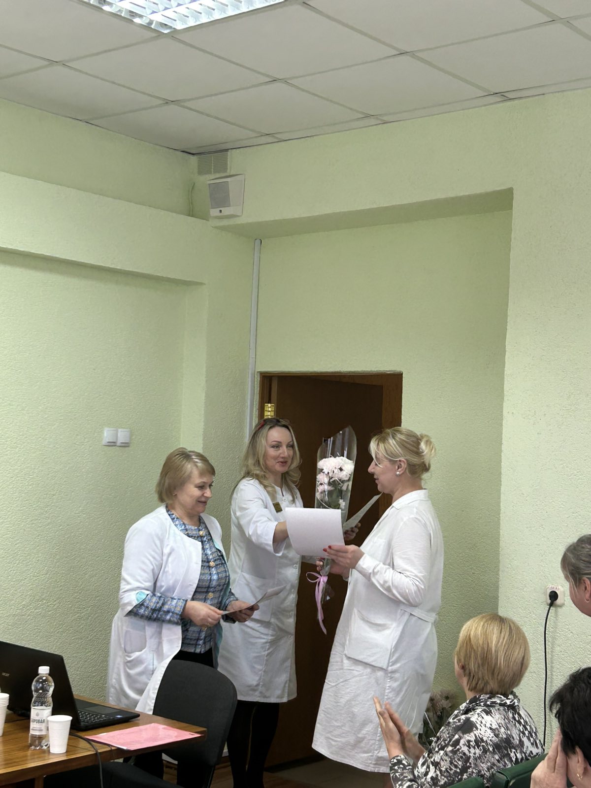 Слова благодарности выразили: заместитель главного врача (по медицинской части) Петранис С.А. и председатель профсоюзного комитета и главная медсестра Лукащук Е.В. Лучшие работники этого года были награждены грамотами и цветочными композициями. Медицинская сестра ОЗКК Громыко И.Е. была отмечена благодарностью Могилевского областного общественного объединения специалистов со средним медицинским образованием.